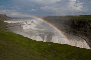 Nach einer weiteren Stunde erreichen wir dem Gullfoss. Ein Regenbogen spannt sich über den ganzen Wasserfall als wir