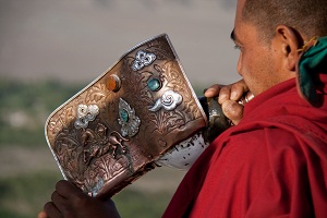 Ein neuer Teil der Gebete mit Trommeln und Hörnern bringt etwas Abwechslung. Die Mönche klatschen rhythmisch dazu.